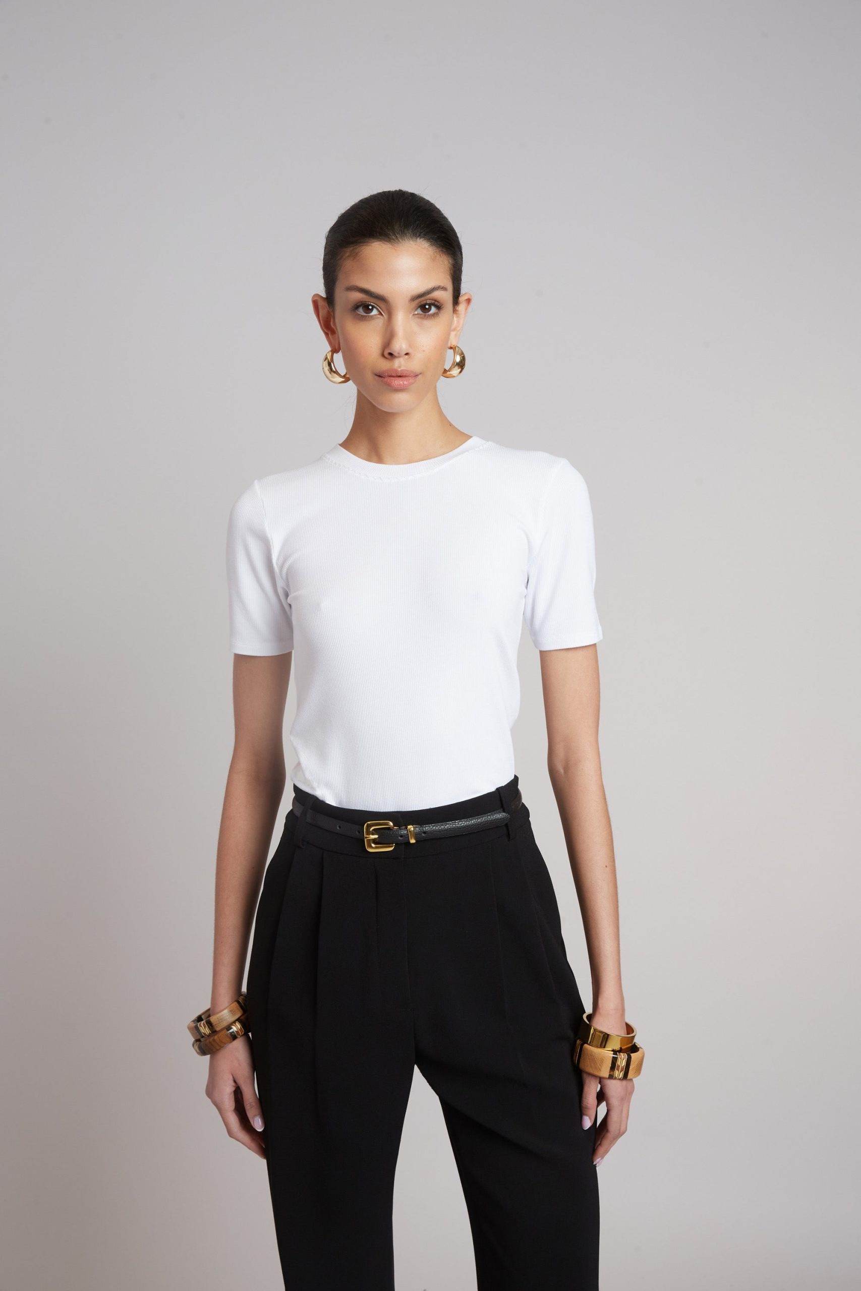 A study in refined simplicity, this short sleeve tee is crafted in finely ribbed knit to trace the form with ease. The subtle stretch and clean finish lend quiet structure, while its minimal silhouette makes it a foundation piece—precise, effortless, enduring.