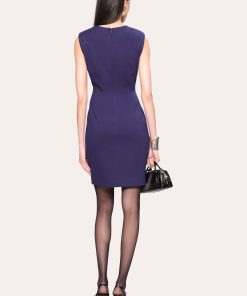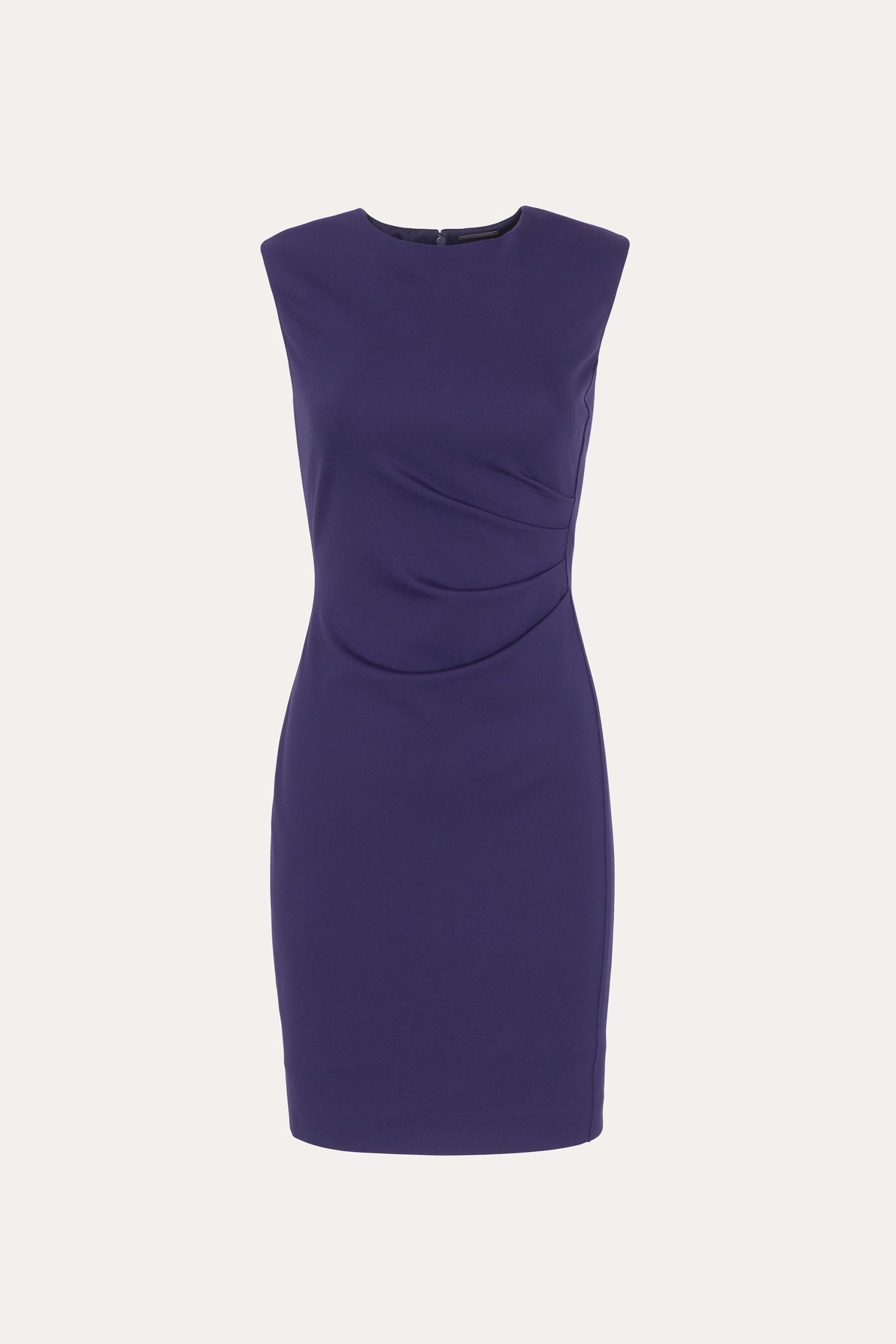 Crafted in double-knit ponte, this sleeveless dress is defined by strong shoulders and artful side ruching, sculpted with subtle strength and refined detail.