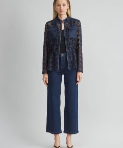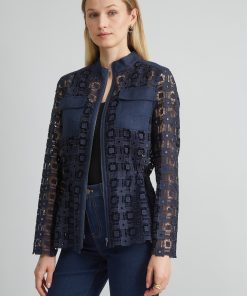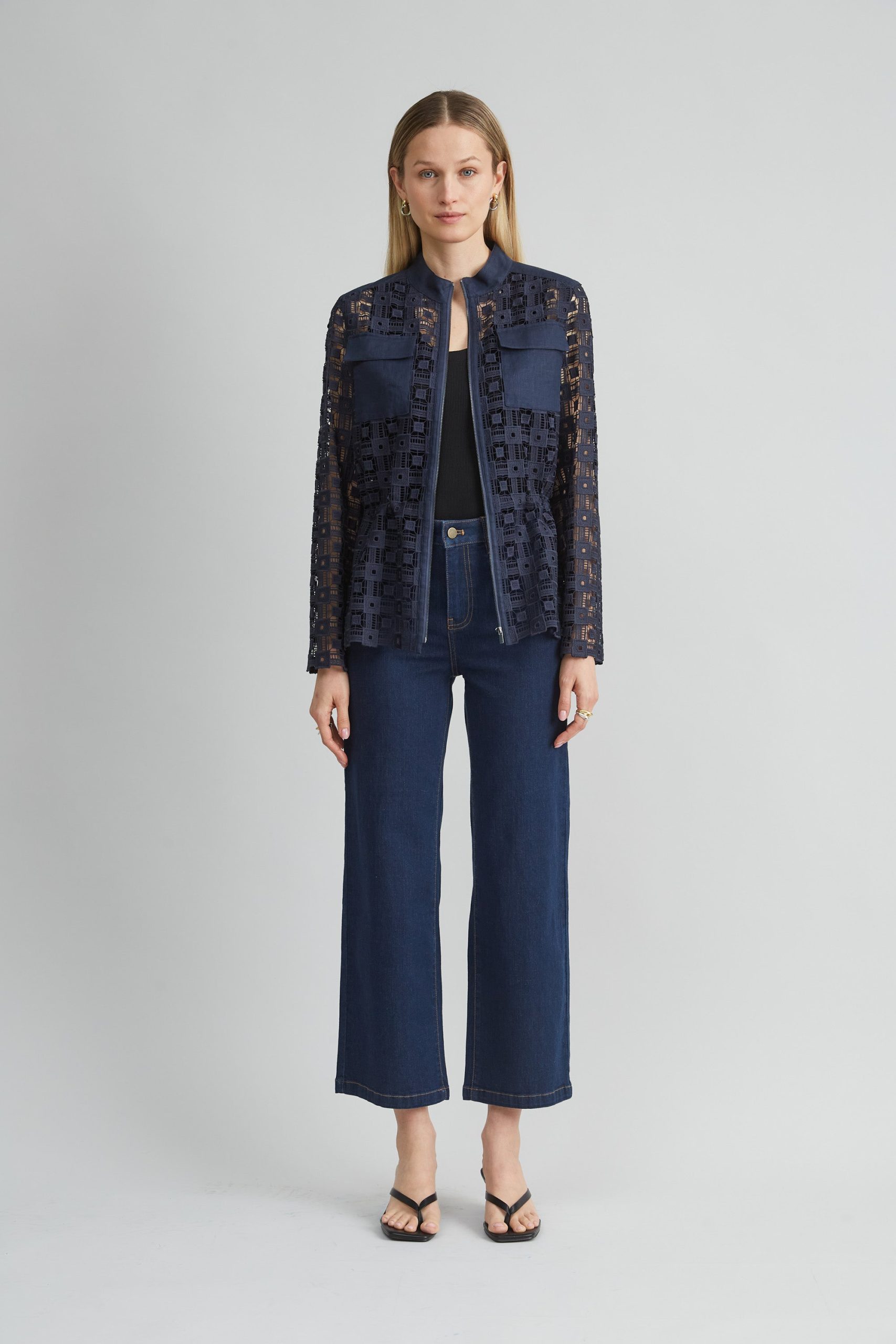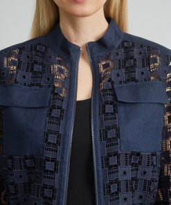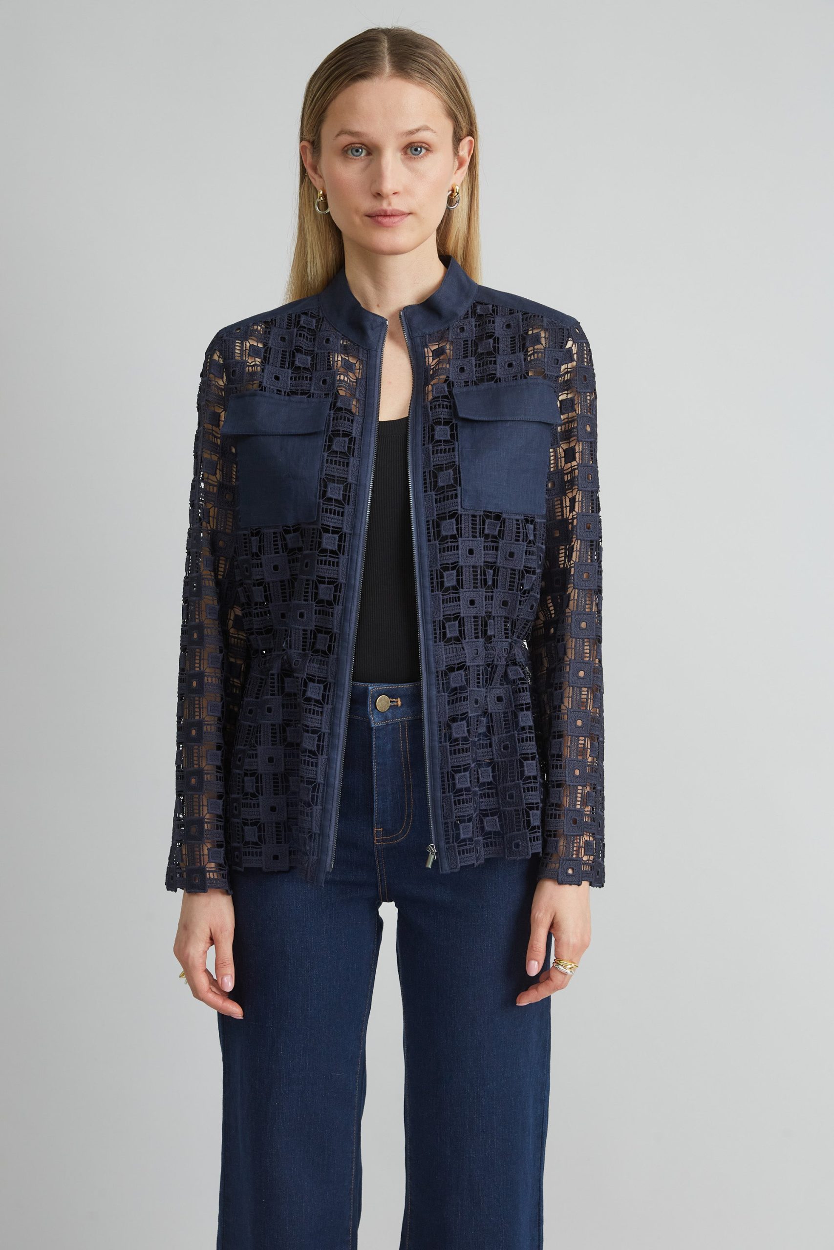 Openwork Lace Jacket with Linen Utility Details, Drawstring Waist & Zip Front Closure