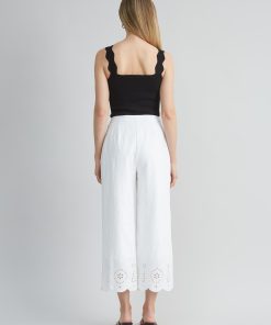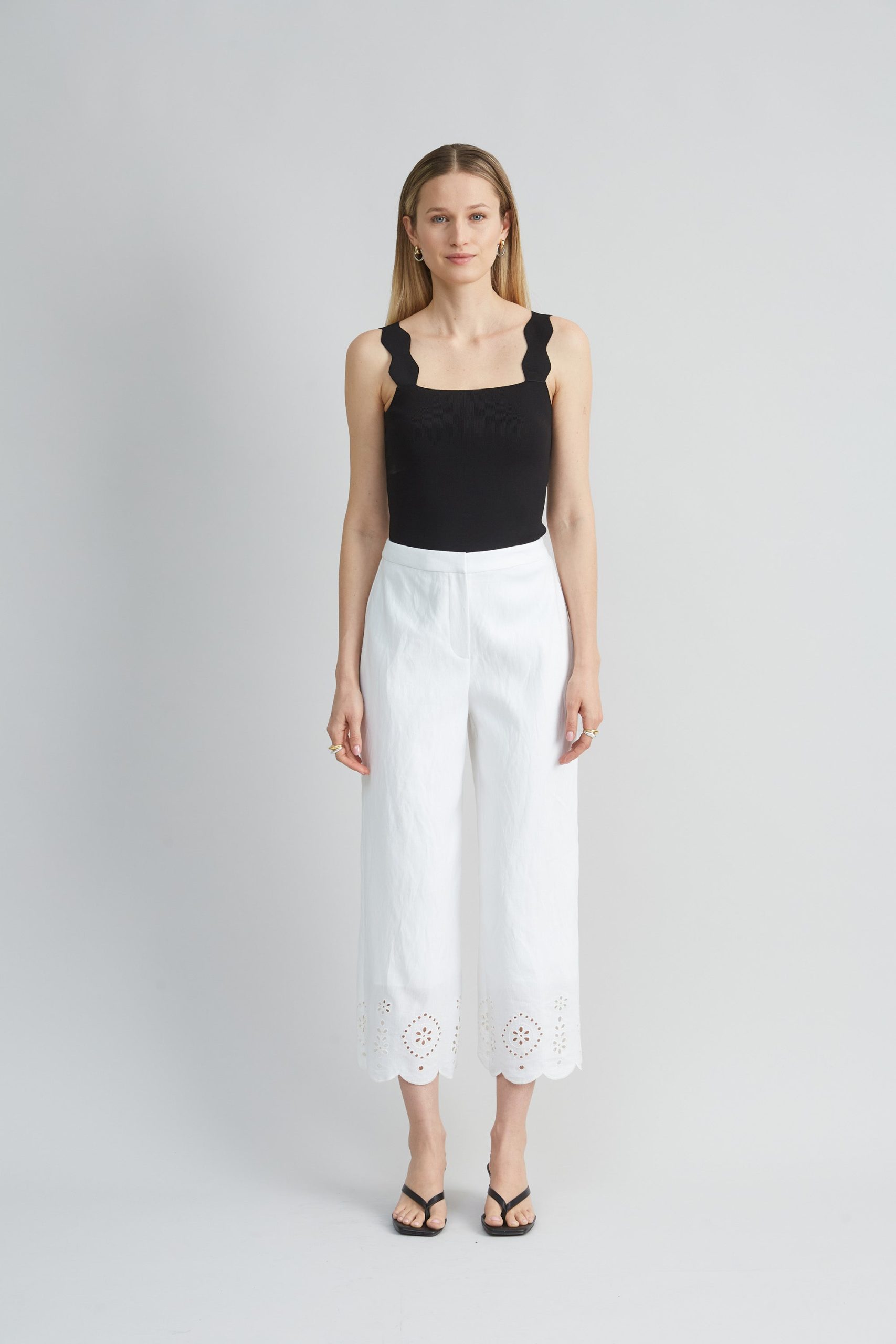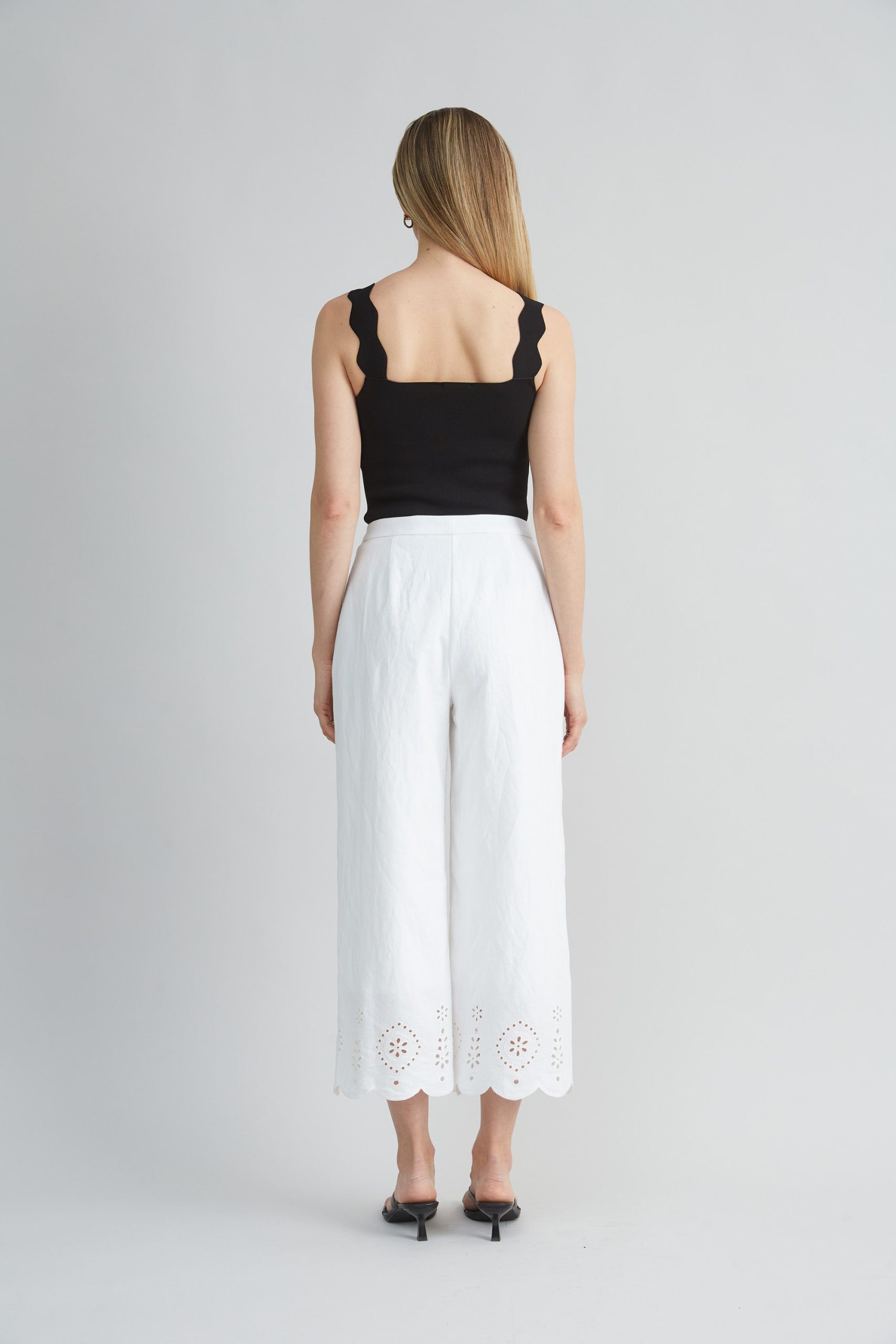 Linen Wide Leg, High Rise, Cropped Pant with Embroidered Scallop Hem
