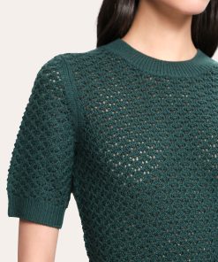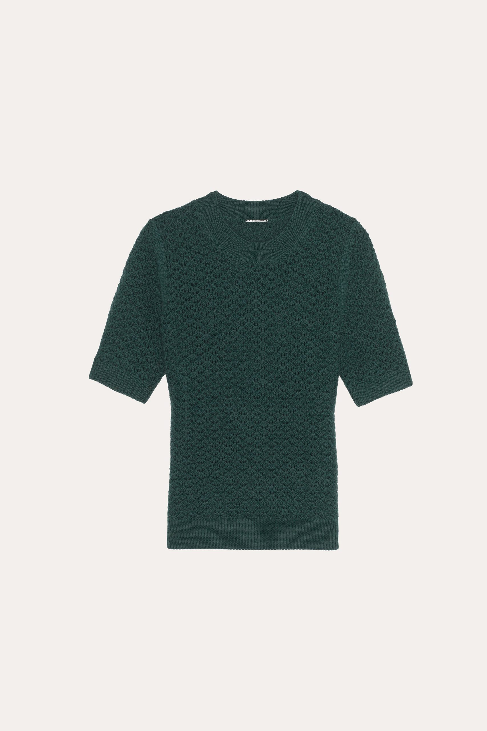 Rendered in superfine Merino Wool with a smooth, ultra-soft hand, this short-sleeved sweater is traced with intricate openwork weave—an interplay of geometry, air, and edge.