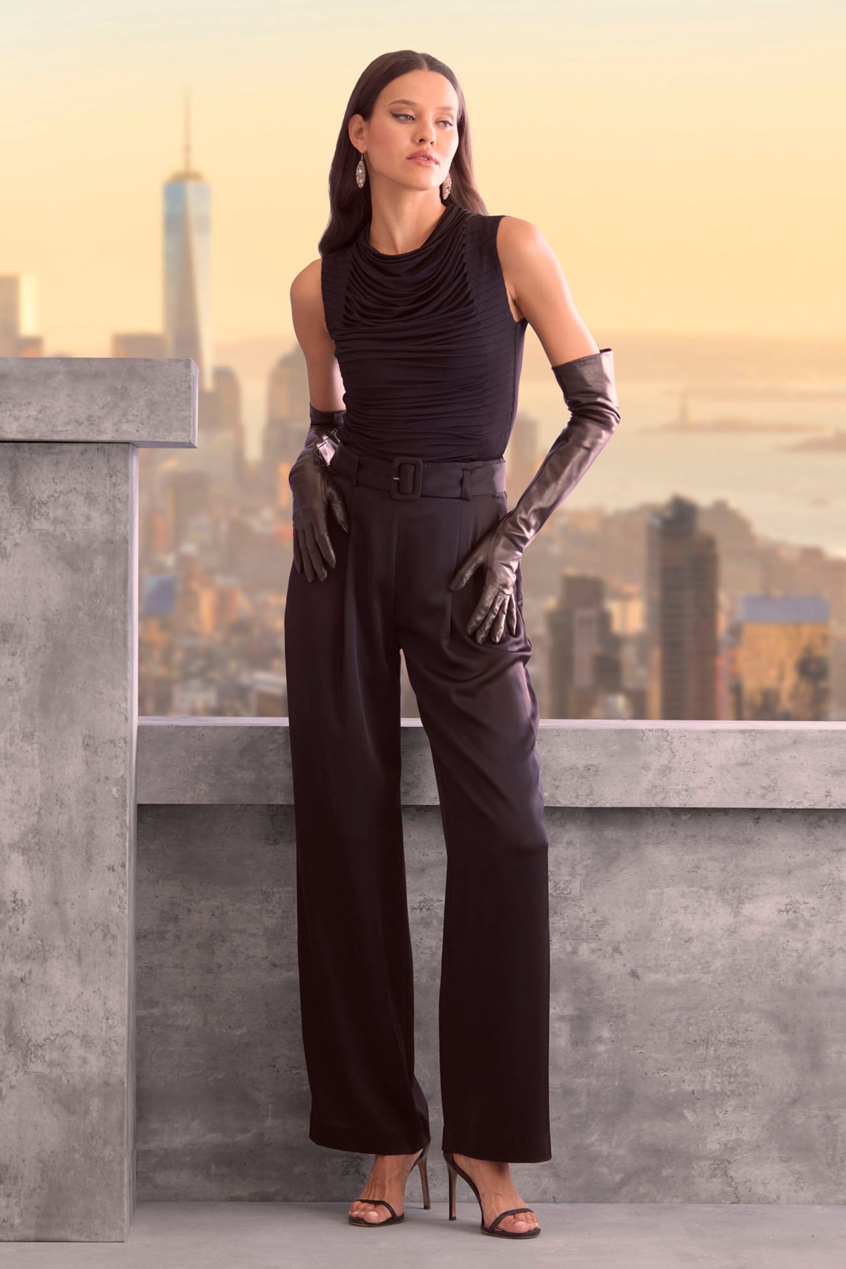 Discover Elie’s ultra-flattering Sleeveless Tucked Matte Jersey Knit Top. The draped neckline adds a touch of elegance, while the tucked pleat details lend a flattering body skimming silhouette. Pair it with plisse velvet or satin for an ultra-chic look.
