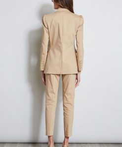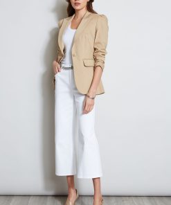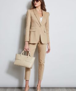 Meticulously tailored, polished, and modern, our single-breasted blazer has pleat detail shoulders, peaked lapels & dart detailing. The contour lines & flattering button placement lend a body skimming silhouette. This cotton blend blazer has the cool factor you are looking for. Pair it with its matching pant for a sleek monotone column or wear it as a separate.