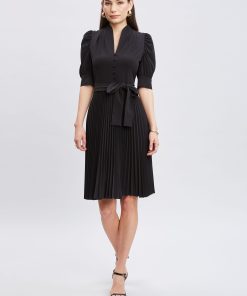 Puff Sleeve Fit & Flare Dress with a Knife Pleated Laser Cut Skirt