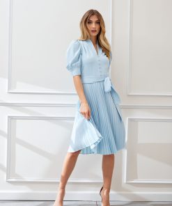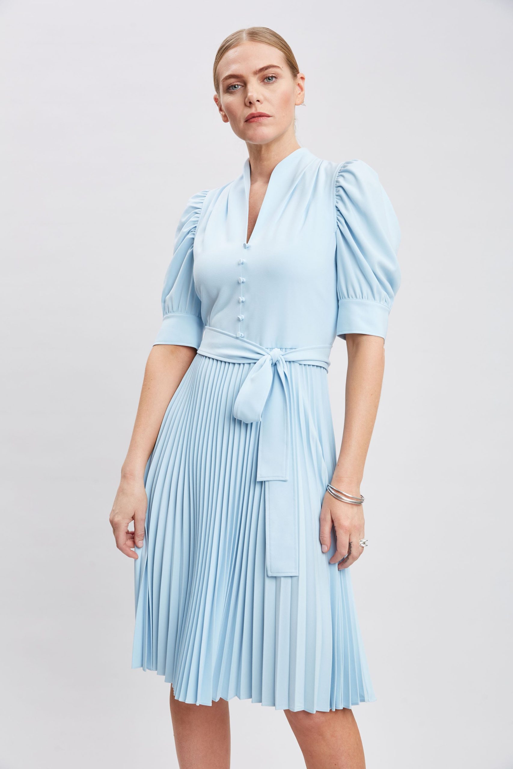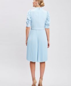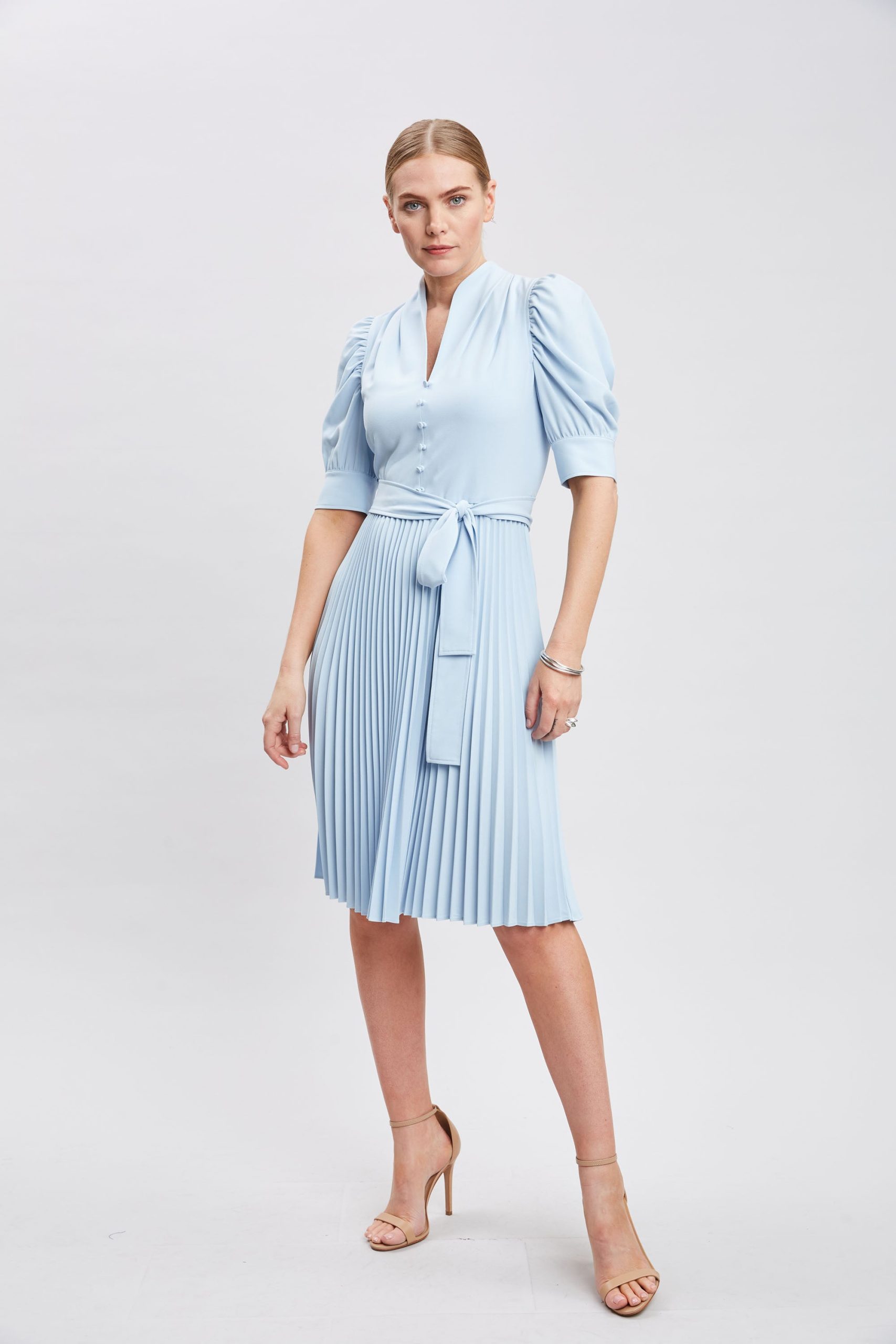 Puff Sleeve Fit & Flare Dress with a Knife Pleated Laser Cut Skirt
