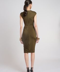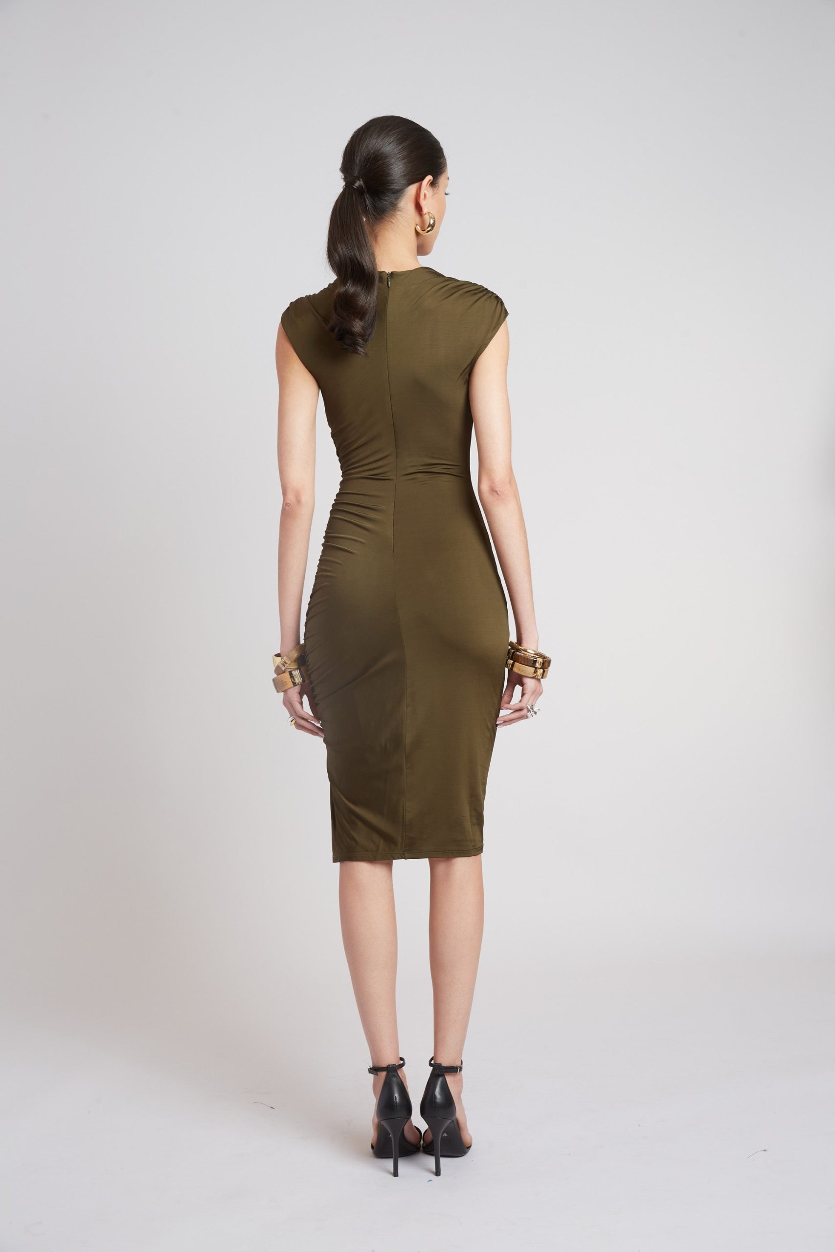 Cut from matte jersey, this ruched silhouette is defined by a crossover neckline with pleated detailing. Subtle gathering at the sides enhances its sculpted fit, offering an effortless balance of structure and softness. Designed to move seamlessly from daytime ease to evening refinement.