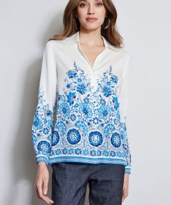 Long Sleeve Cascade Garden Floral Scarf Print Button Down Shirt