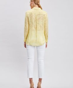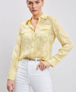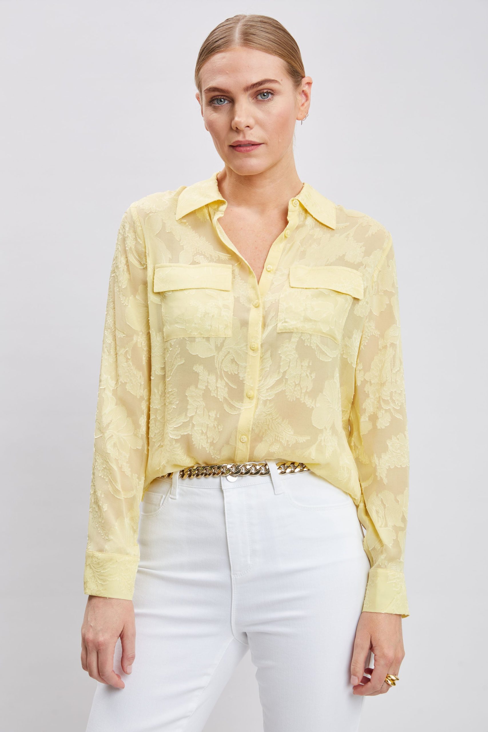 Washed Silk Jacquard Long Sleeve Button Down Top with Utility Patch Pockets