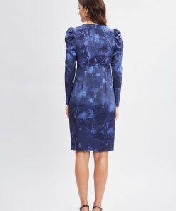Long Sleeve Silk Satin Printed Dress with Ruching Affect & Puff Shoulders