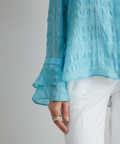 Our Jacquard Top speaks of a new season. This femme take on the classic button down is the shirt your closet has been looking for. Crafted in a Plaid Silk Jacquard with tiered ruffle cuffs, you’ll live in this shirt year-round.