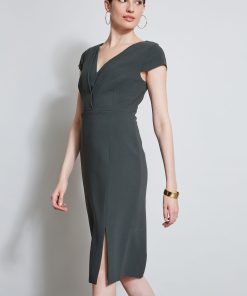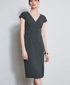 Elie’s take on the season’s must have sheath dress. The body contouring lines accent its modern slit & double layer v-neckline. Designed in our signature Fluid Crepe, it flatters every curve. This dress is destined to become a favorite for desk to dinner.